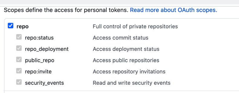 • Ensure you PAT has the repo scope selected: