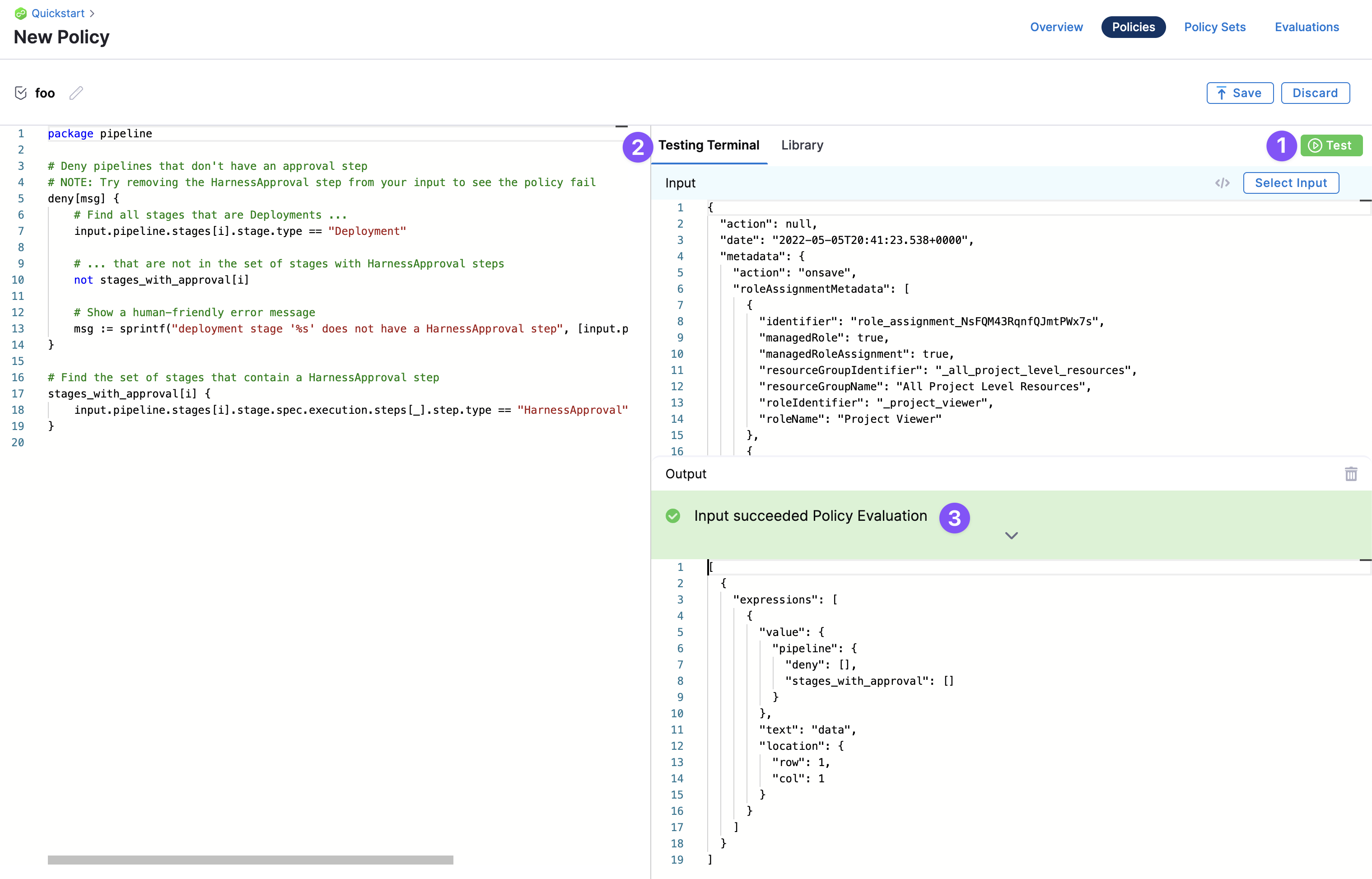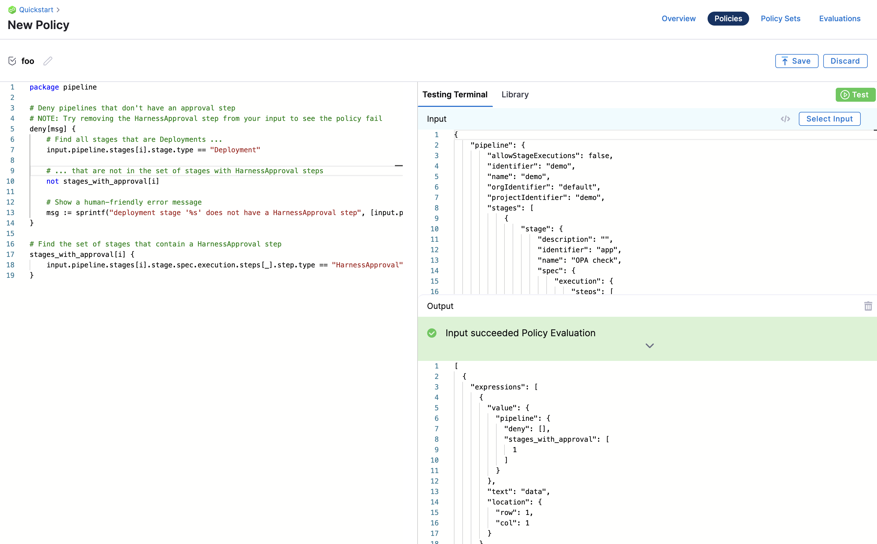 Harness policies are written and tested using the built-in policy editor.