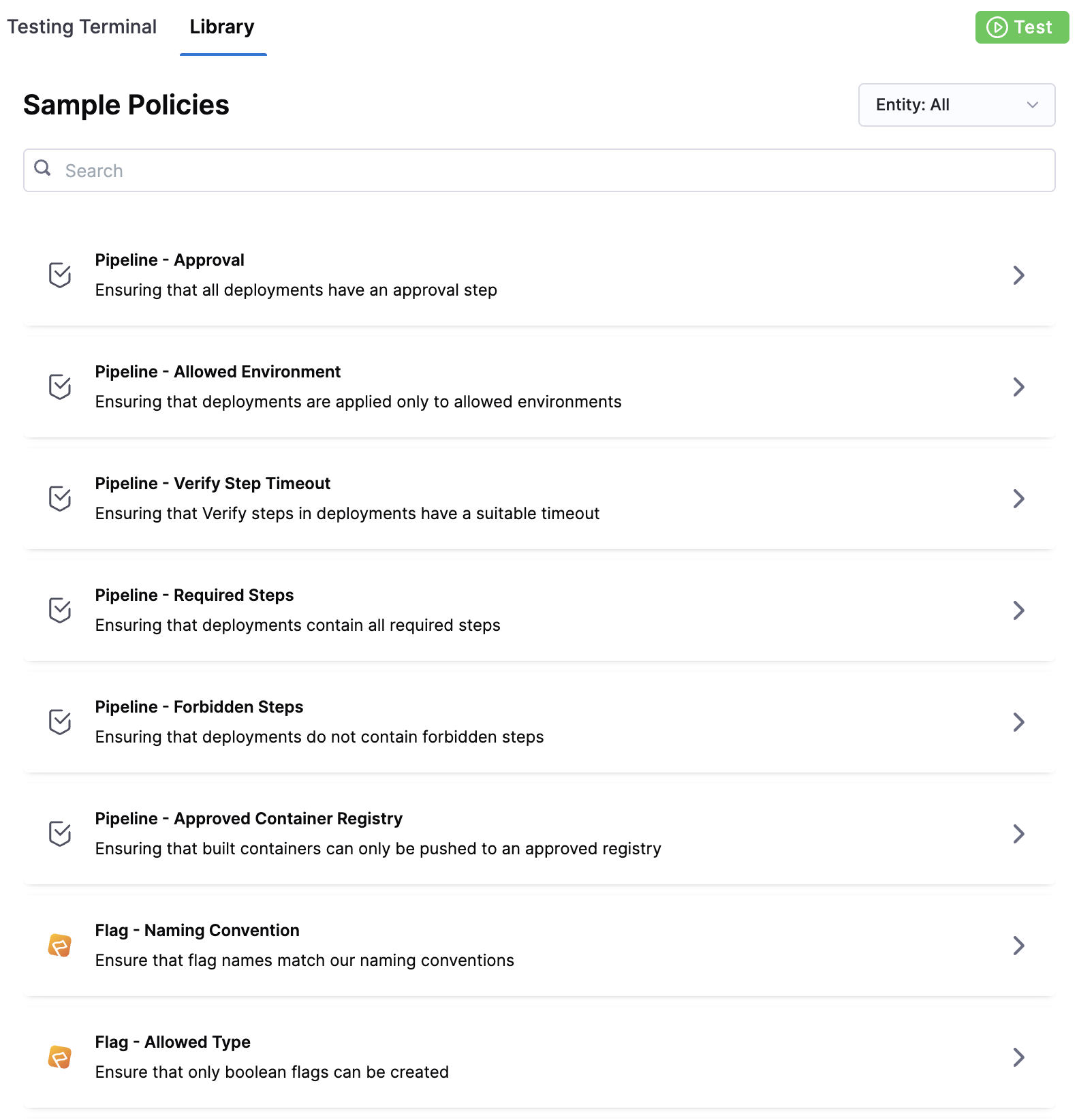 The Custom entity type provides flexibility to enforce policy evaluations against any input payload during Pipeline execution. This is done using the Policy step. Go to add a Governance Policy step to a pipeline for more information.