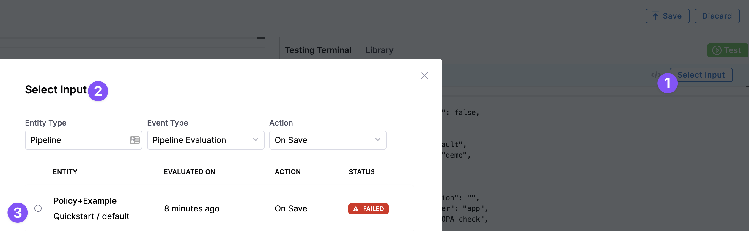 The Testing Terminal lets you test the policy against real inputs while you're developing it. You can select input payloads from previous evaluations to test what will happen when your policy is evaluated.