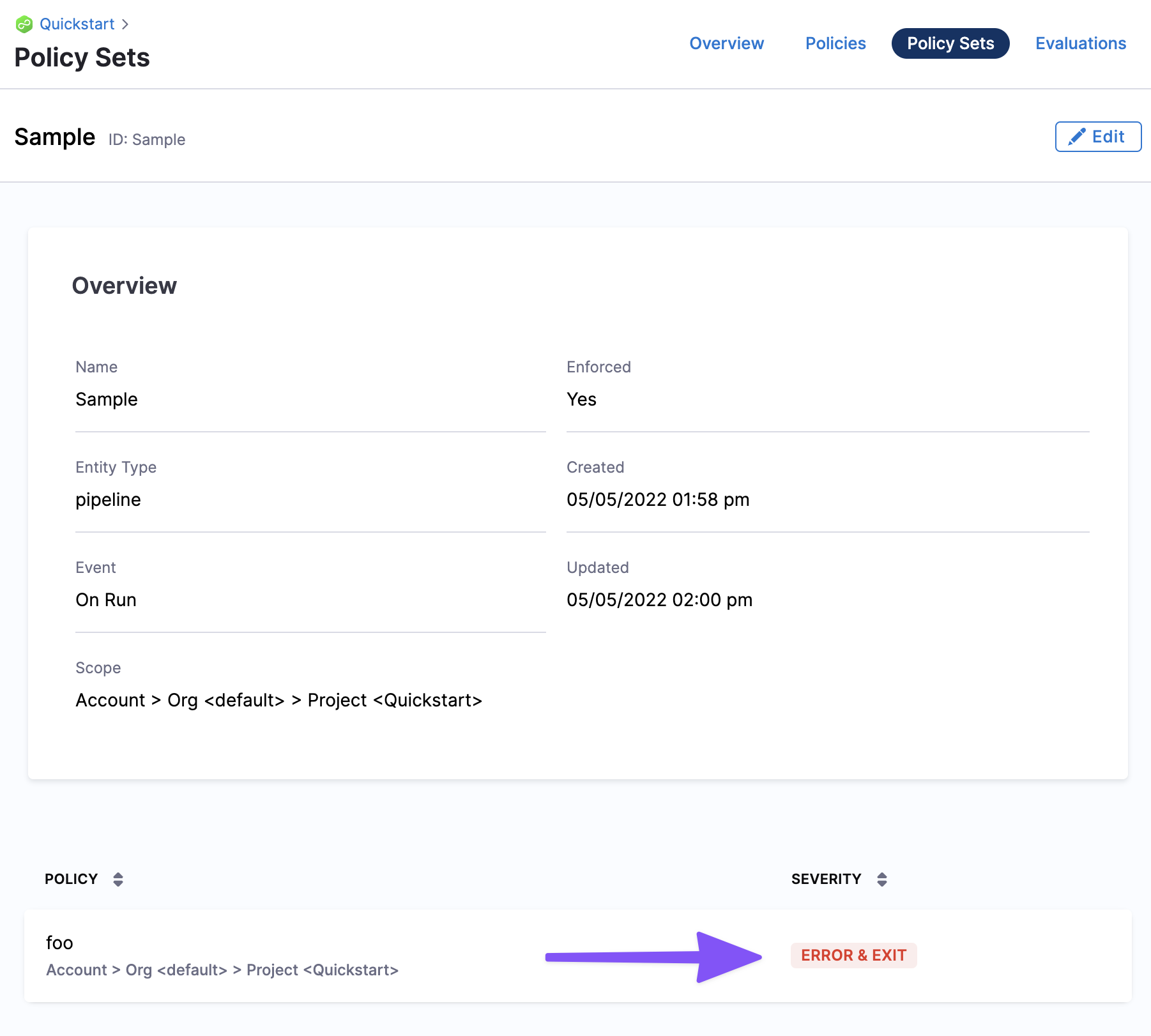 Each policy in the set is also assigned a severity that determines what will happen if the policy evaluation fails (Error and Exit, Warn and Continue).