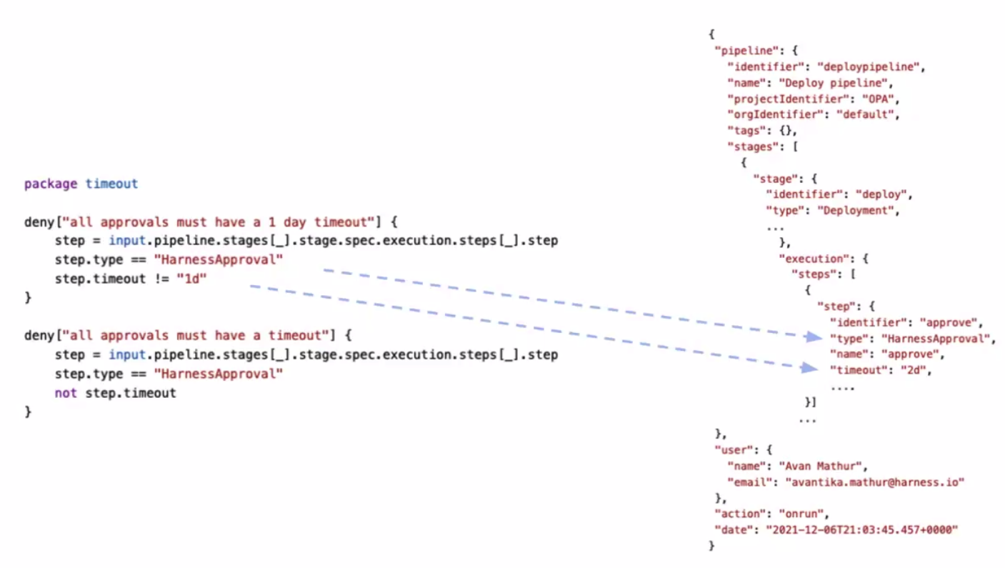 Policies are written against an input payload. The input payload is the JSON of the entity that the policy is being enforced against (Pipeline, Feature Flag, etc).