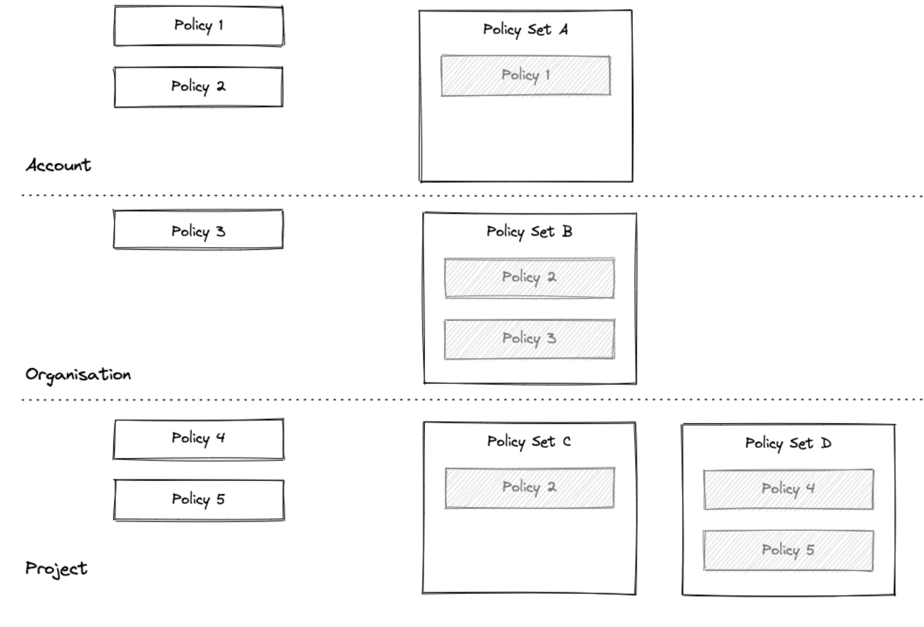 • Policies saved at the Account level can be added to Policy Sets in the Account, or Orgs and Projects within that Account.