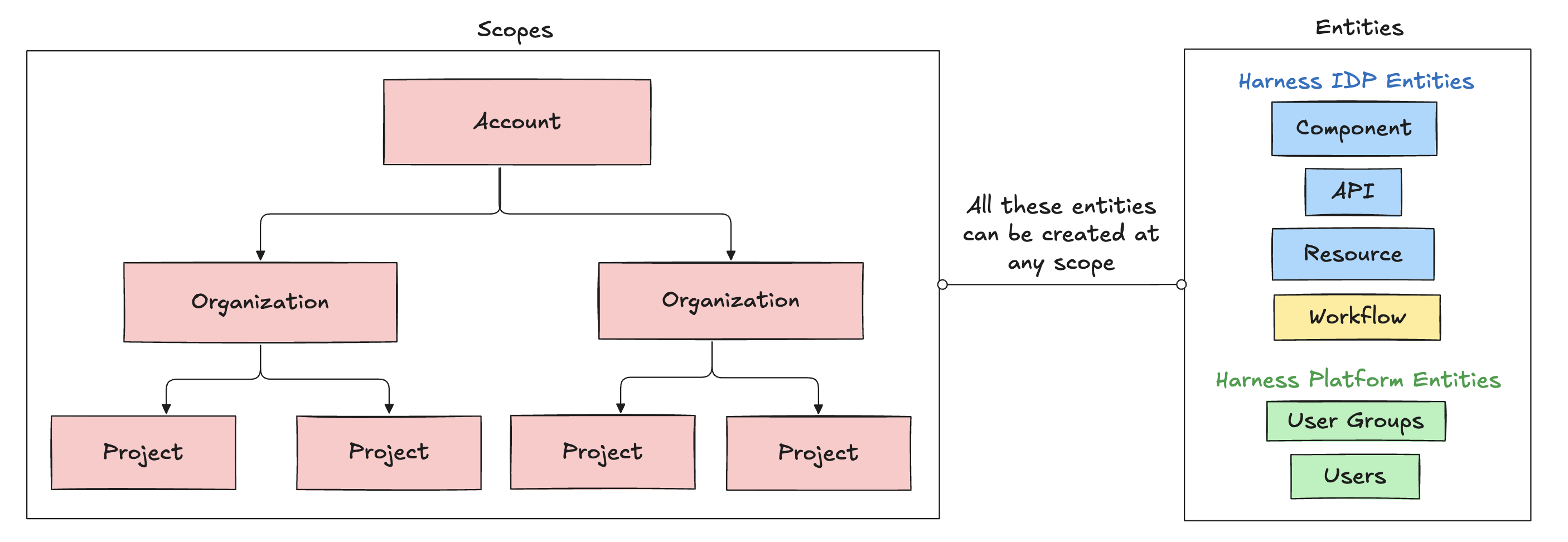 IDP 2.0 follows a three-level hierarchical structure. The three levels, or scopes, are Account, Organization, and Project. IDP resources can be explicitly created at any of these scopes. Learn more about the Harness platform hierarchy.