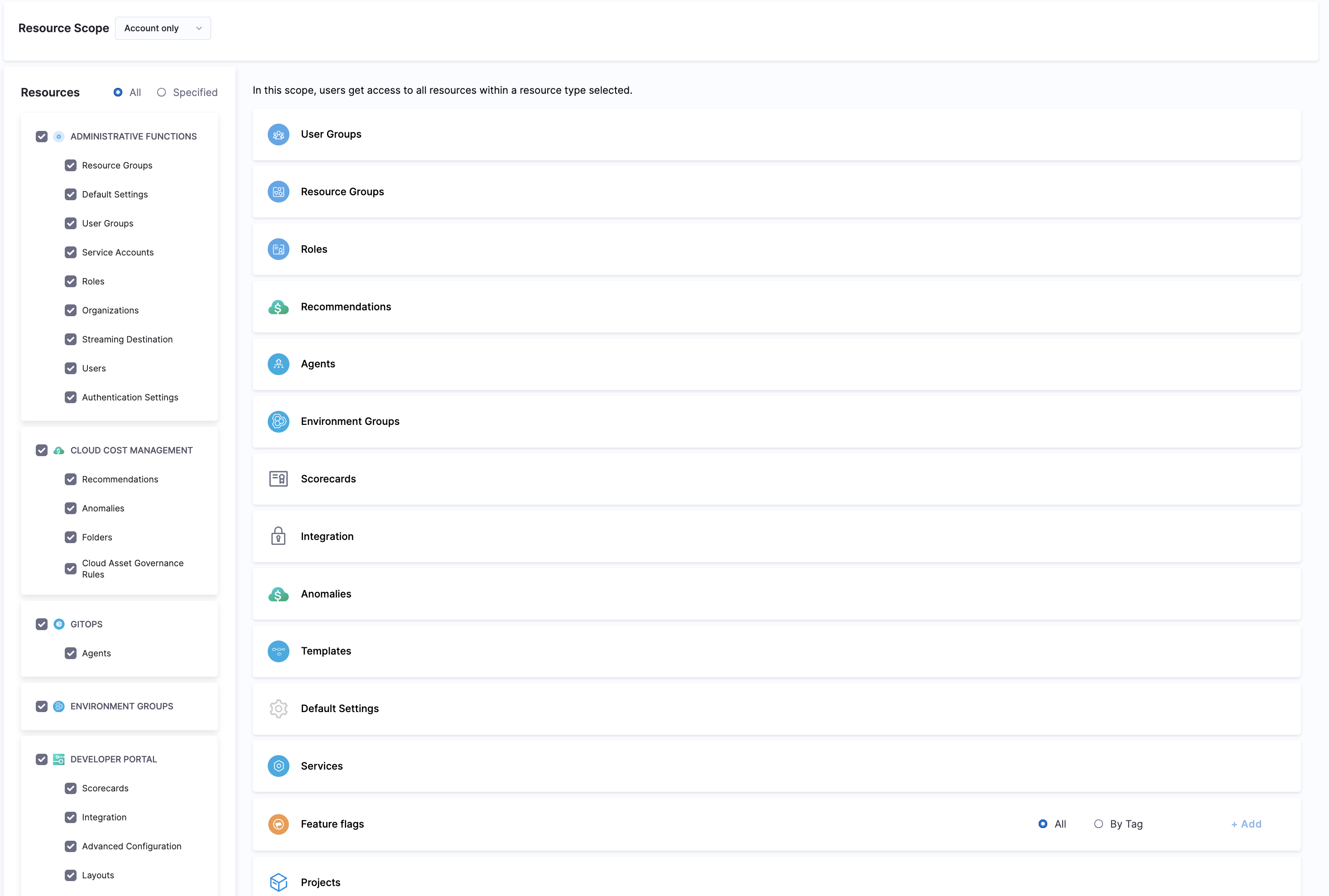 You can select which resources to include in a group based on the role you want to assign. Harness provides built-in resource groups at every scope, but you can also create custom ones. Learn more about resource groups.