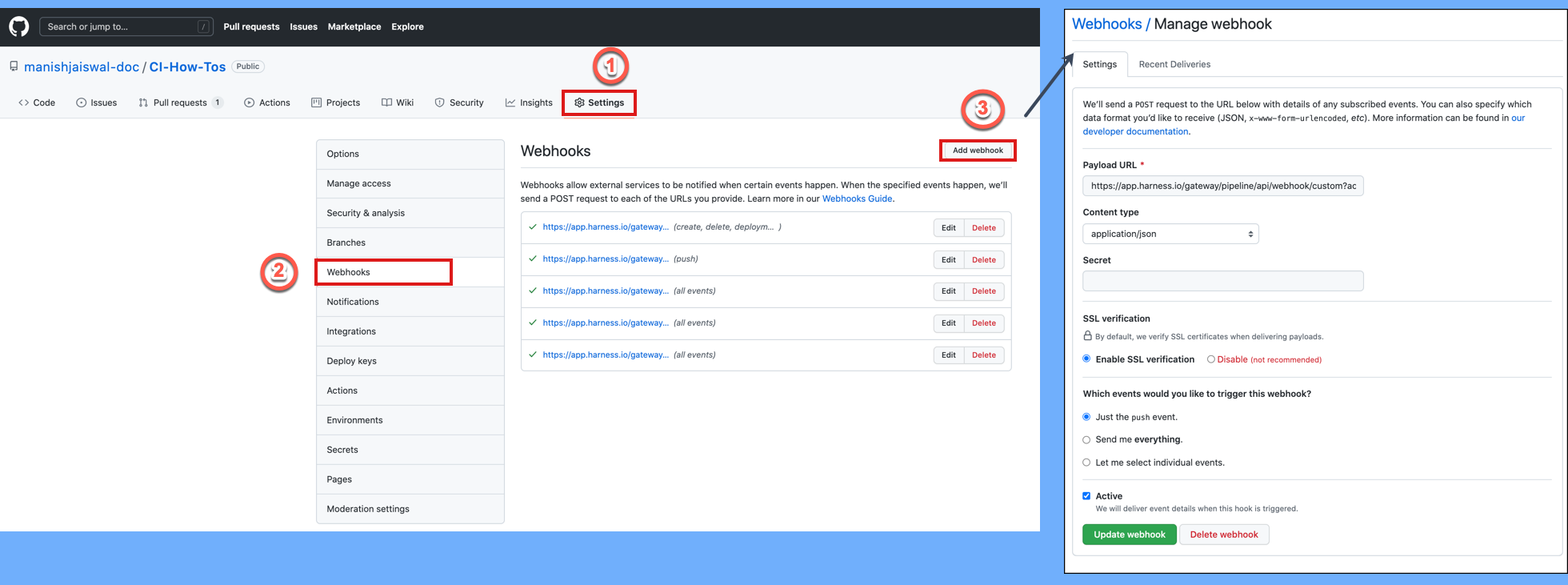 However, if automatic registration fails or you created a custom webhook, you must manually copy the webhook URL and add it to your repo webhooks.