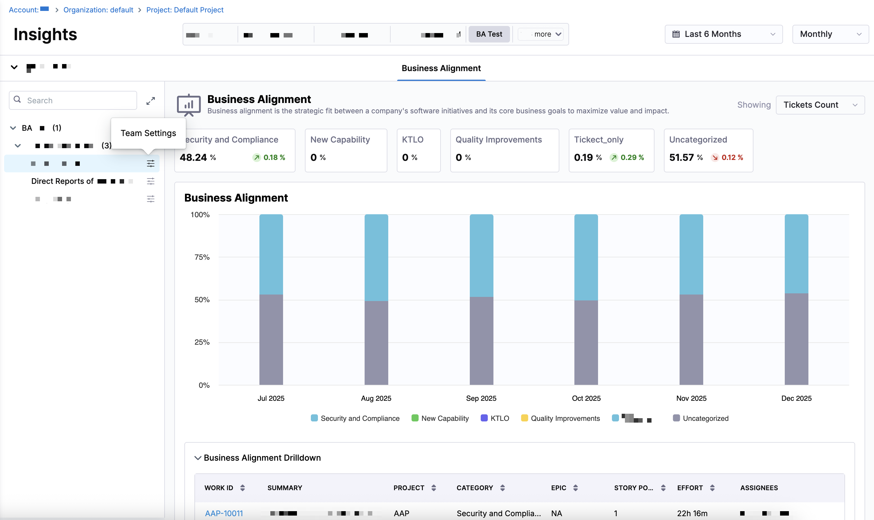 Business Alignment reflects how closely software delivery work aligns with your organization's strategic priorities. It categorizes ticket-level work into pre-defined business categories, including: